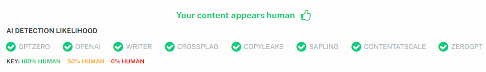 Undetectable AI is still in its infancy. They are constantly updating the tool and adding more options. But for now, there are 135 combinations of readability, purpose, and human-scale settings, which makes it extremely difficult to test them all. Thus, I’ve selected a handful of combinations that performed well for me. Please remember that no matter which combination of settings, the final result passed all 8 AI detectors by default. My experiment is more focused on passing the Originality.ai detector and how well it performs on Originality’s human score and readability score.
